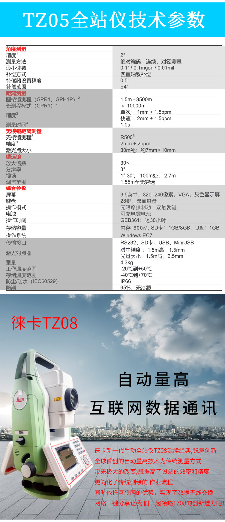 徠卡測量系統(tǒng)匠心制造、再續(xù)經(jīng)典。新一代手動型徠卡全站儀TZ05延續(xù)了前 代穩(wěn)定可靠的產(chǎn)品性能,并帶來了別具匠心的升級之道。全新升級的測 距模塊讓測量成果更加可靠,能夠更快速的完成日常測量任務;全新升 級的工藝品質(zhì),輕松應對各種極端環(huán)境的挑戰(zhàn)。徠卡TZ05全站儀,感受全新升 級的測量魅力。