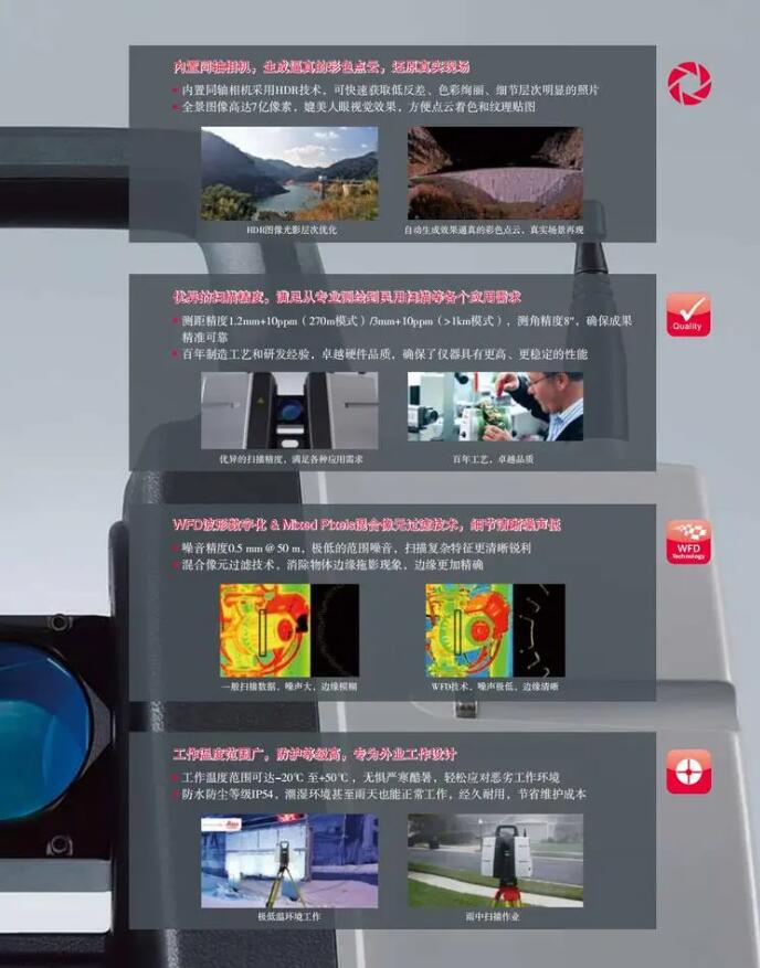 徠卡測量系統(tǒng)打造的長測程三維激光掃描儀ScanStation P50,在繼承高精度的測角測距技術(shù)、 WFD波形數(shù)字化技術(shù)、 Mixed Pixels混合像 元技術(shù)和HDR圖像技術(shù)的同時,掃描距離提高至1km以上,使得徠卡ScanStation P50具有更長的測程和更強(qiáng)大的性能,滿足長距離及各種掃描任務(wù)需求。
